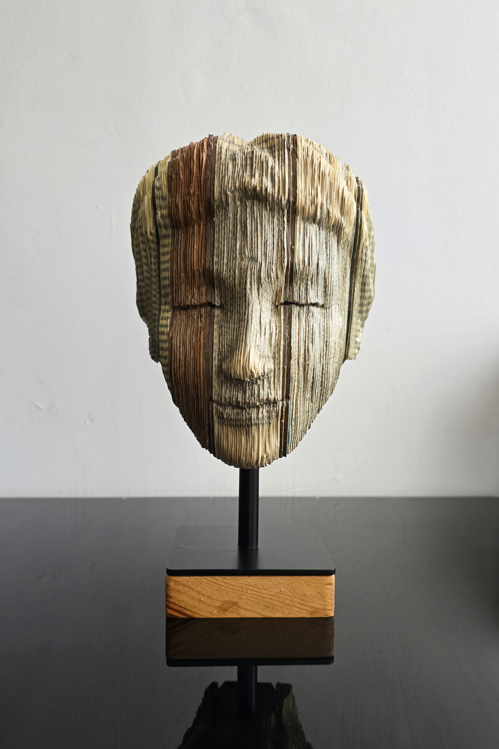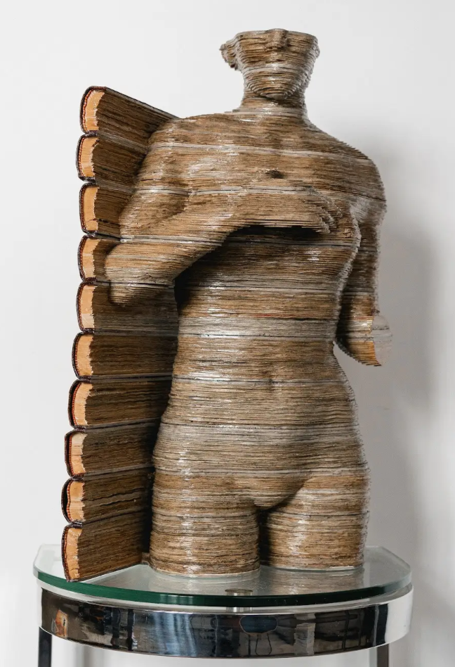 LEl busto de una mujer tallada en libros viejos restaurados, utilizados para generar detalles únicos a la obra.