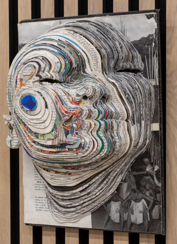 El rostro de una mujer indigena desafiante esculpida en unas enciclopedias de antropología de 1960 restauradas.